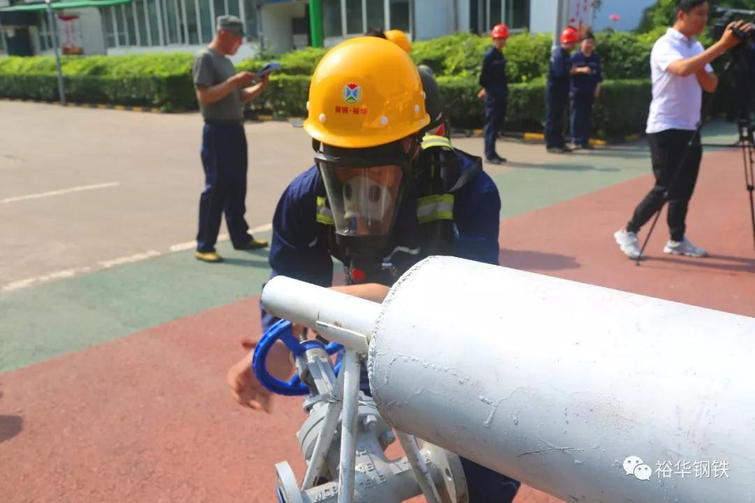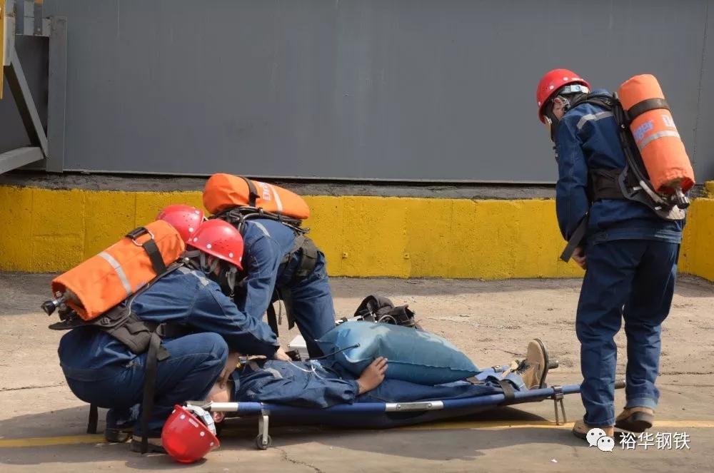 安全副部长李海军宣布比赛开始!模拟事故通报炼铁车间煤气管道发生泄漏,致1人中毒,各分厂应急指挥部接到报警后,派出救援队伍立即出动,进行应急救援。能源队、烧结厂、炼钢厂、炼铁西区、宽带钢、炼铁东区、高线厂七支参赛队依次上场,进行技能展示。